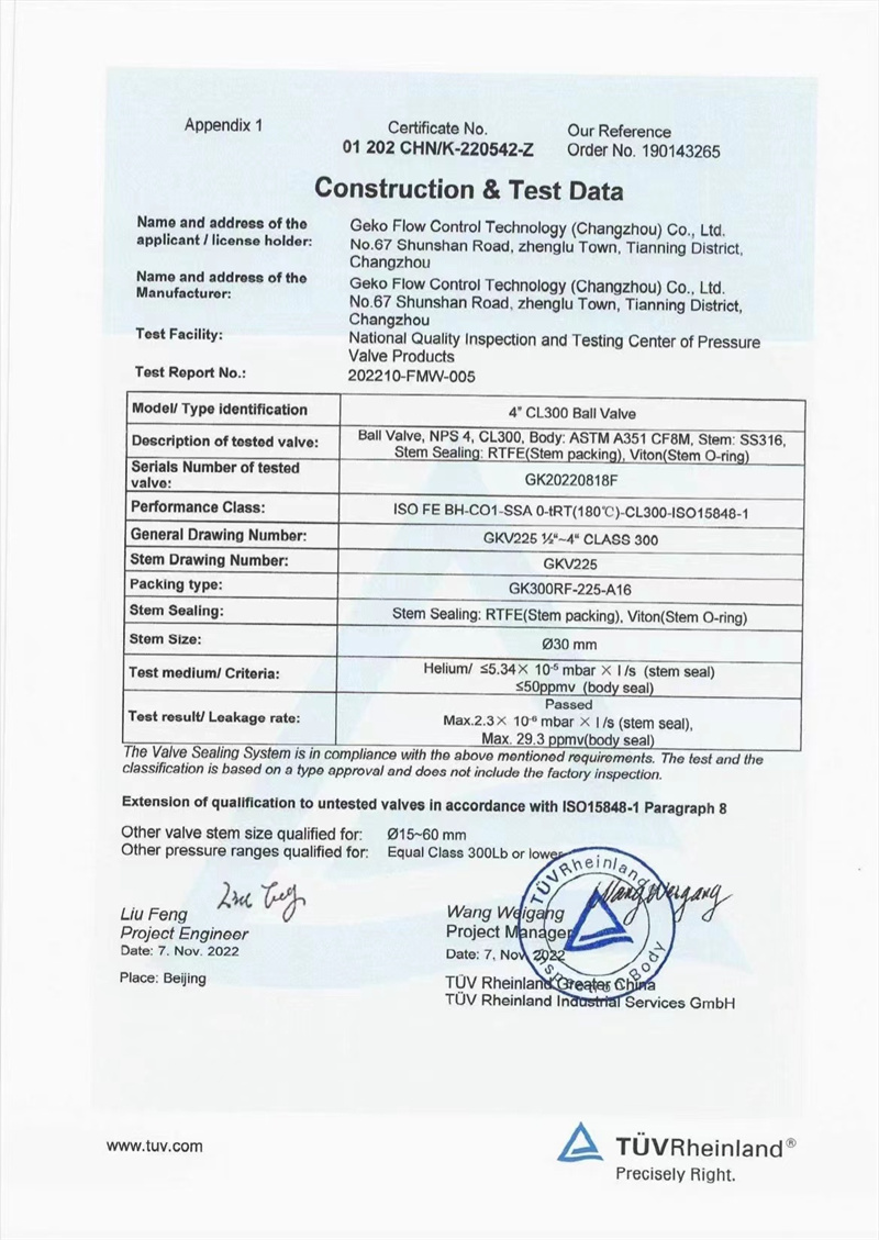 حصل مصنع Geko Valves & Controls في الصين على شهادة TÜV ISO15848 للانبعاثات المنخفضة لصمامات الكرة Geko